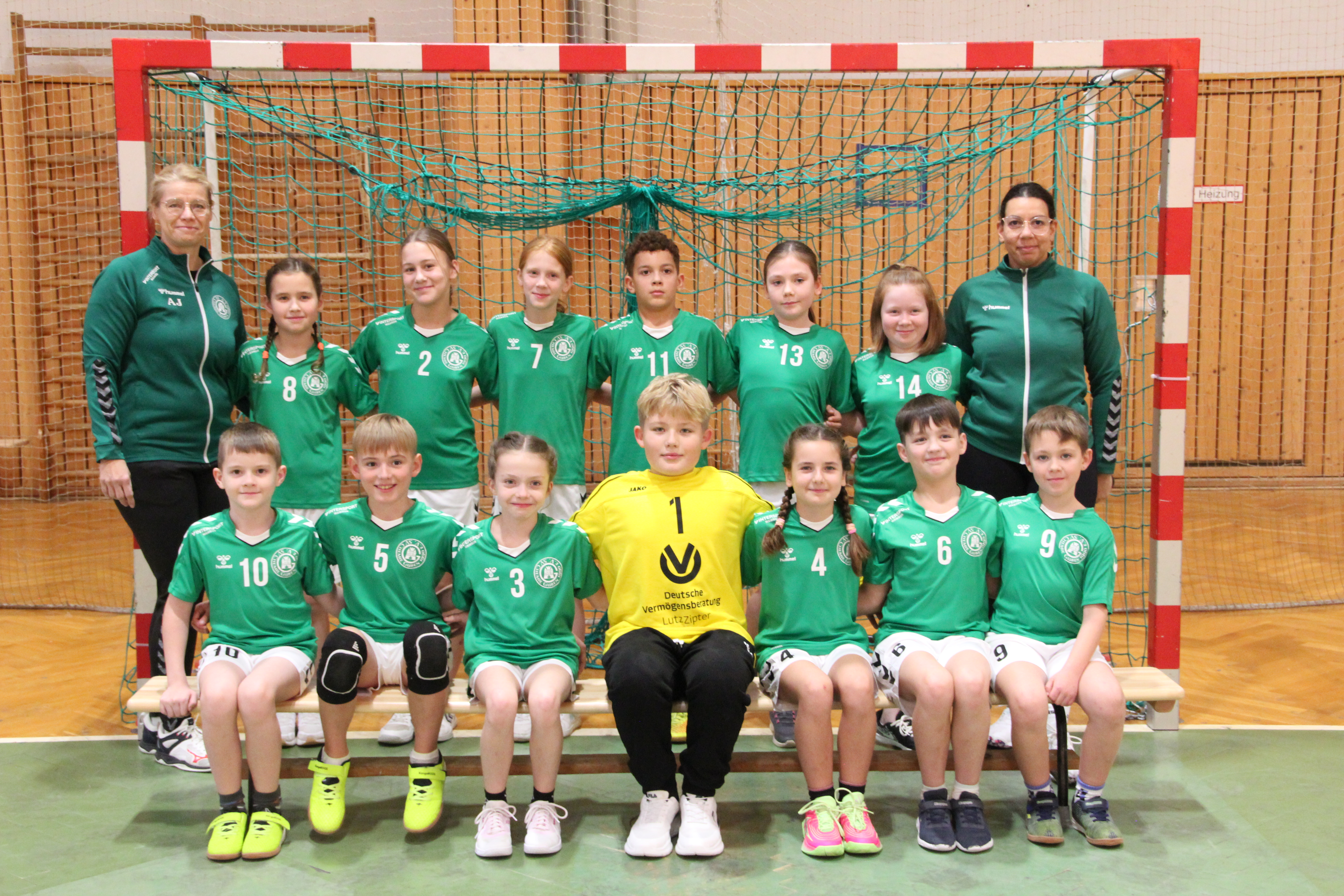 hinten v.l.n.r.: Aline (Trainerin), Nele, Lina, Sophie, Lina, Kira, Marcel (Trainer)